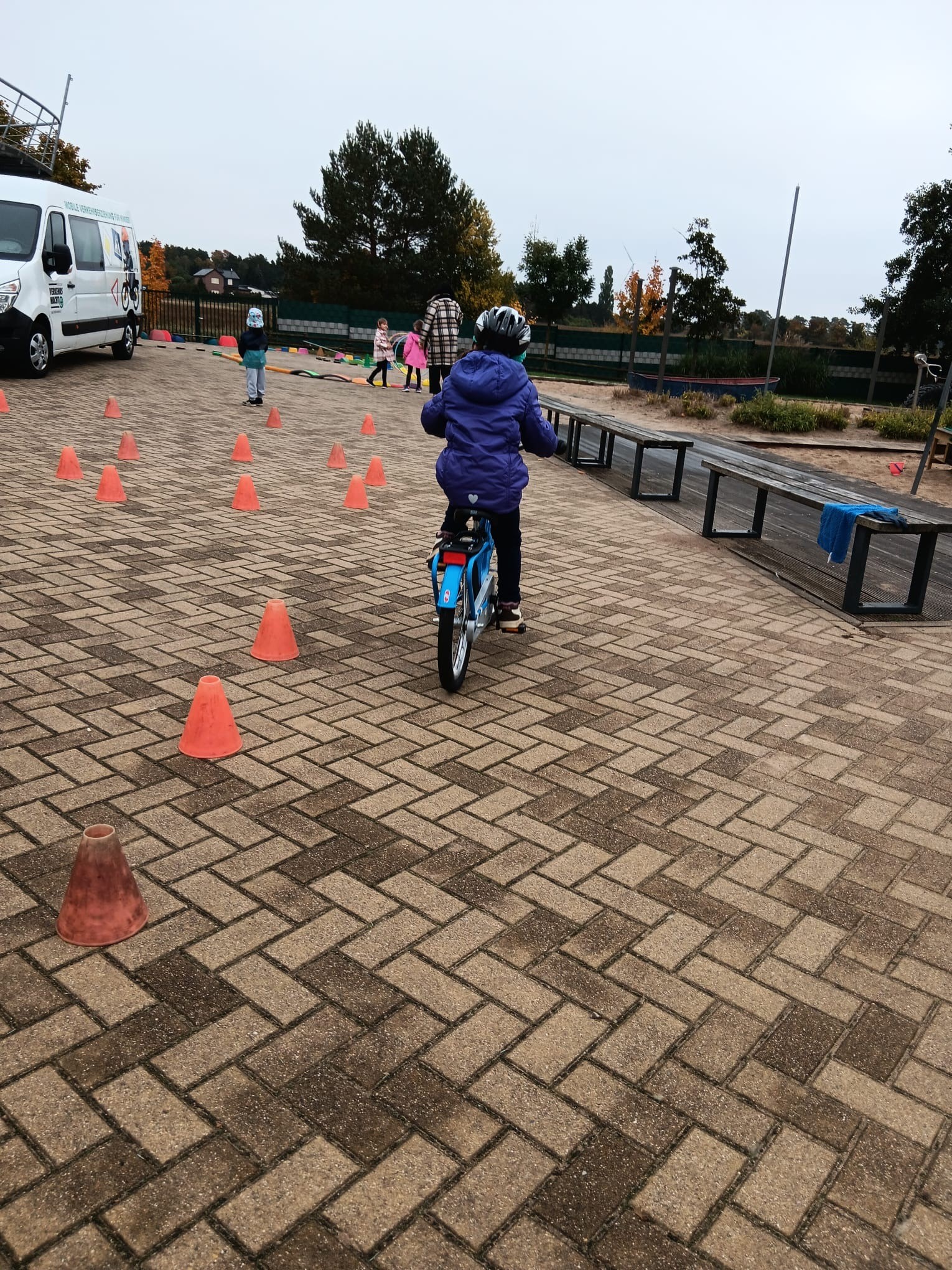 Im Anschluss ging es auf den Spielplatz, der sich für den Tag in einen kleinen Verkehrsparcours verwandelt hatte. Mit Laufrädern und kleinen Fahrzeugen durften die Kinder selbst ausprobieren, wie man sicher durch den „Straßenverkehr“ fährt. Unterstützt von den Mitarbeitenden der Verkehrswacht und den Erzieherinnen konnten sie spielerisch das richtige Verhalten im Straßenverkehr üben.