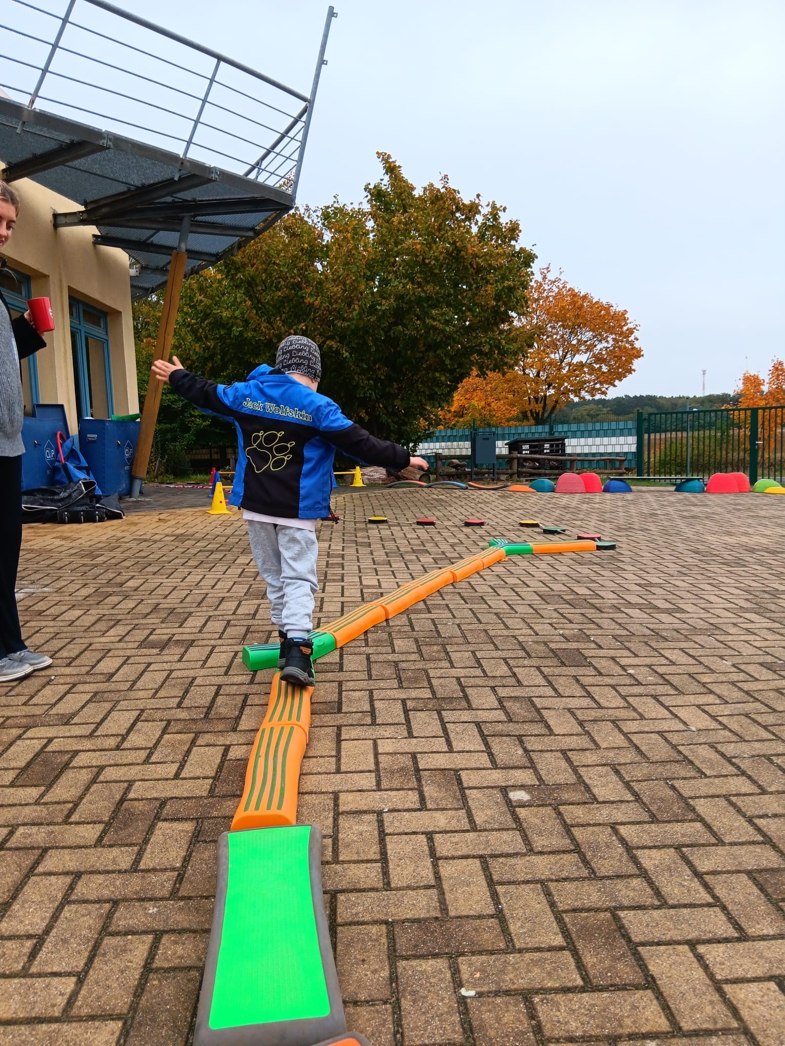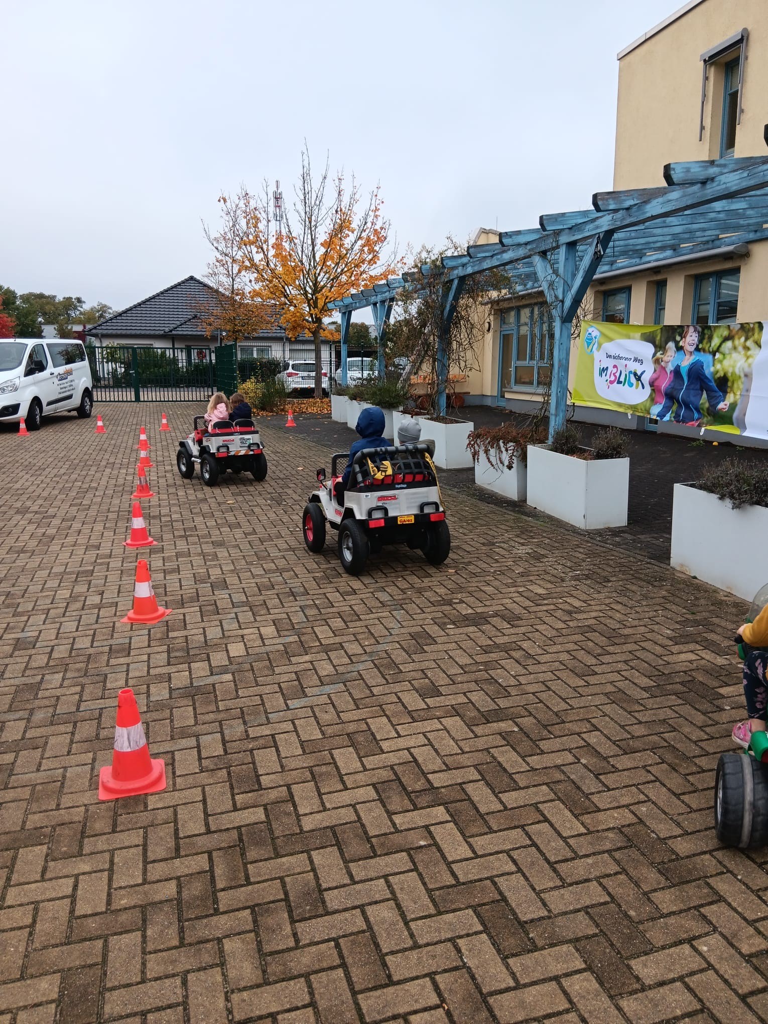 Im Anschluss ging es auf den Spielplatz, der sich für den Tag in einen kleinen Verkehrsparcours verwandelt hatte. Mit Laufrädern und kleinen Fahrzeugen durften die Kinder selbst ausprobieren, wie man sicher durch den „Straßenverkehr“ fährt. Unterstützt von den Mitarbeitenden der Verkehrswacht und den Erzieherinnen konnten sie spielerisch das richtige Verhalten im Straßenverkehr üben.